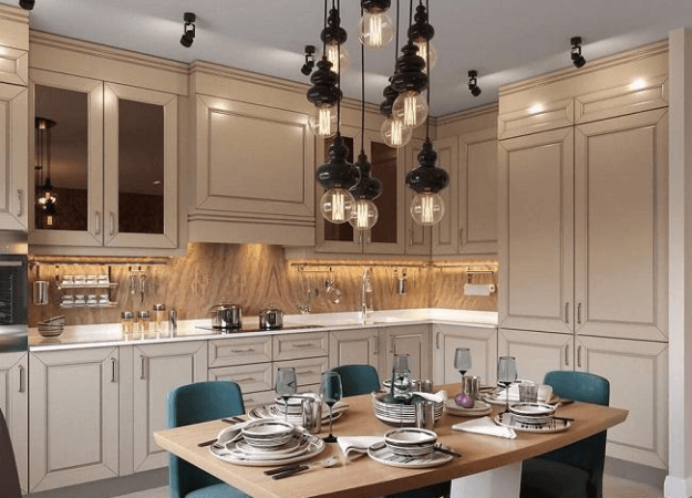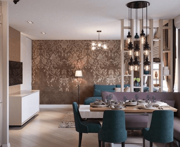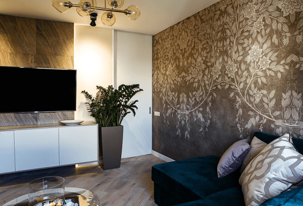 Кухня плавно перетекает в гостиную. Общая площадь обеденной и кухонной зоны составляет 30 м?. Для кухни артист подобрал светлую мебель, выполненную в классическом стиле. В гостиной расположен угловой бирюзовый диван, круглый журнальный стол и большой плазменный телевизор. На полу красуются большие прямоугольные вазы с искусственными ветками. Стены украшены глубоким цветочным орнаментом.