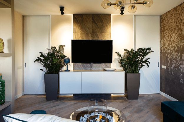 Внутреннее убранство помещения отличается простотой. Мебели здесь немного, все стены выкрашены в светлые тона. Одну из комнат артист выделил для большой гардеробной.