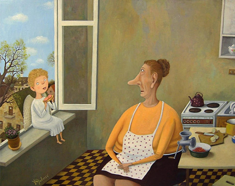 И поди пойми, прошлое на них изображено или настоящее: в провинциальных городах время тянется медленнее, чем в столицах, в тамошних универмагах и по сей день покупателей приветливо встречают лохматые валенки, тяжелые чугуны и необъятные розовые дамские рейтузы с начесом, непременная деталь гардероба муз художника. Там в густонаселенных дворах гуляют куры в сопровождении многочисленного цыплячьего потомства и теснятся жители – странные и забавные мечтатели.