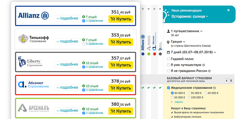 Чтобы сравнить предложения практически всех крупных страховых компаний и выбрать подходящий по цене и набору опций полис, вы можете воспользоваться онлайн-сервисом cherehapa.ru. В открывающейся форме указывается страна, даты начала и окончания поездки, возраст и число человек и поиск выдаёт варианты с минимальными тарифами. Их можно дополнять «кирпичиками» нужных вам опций.