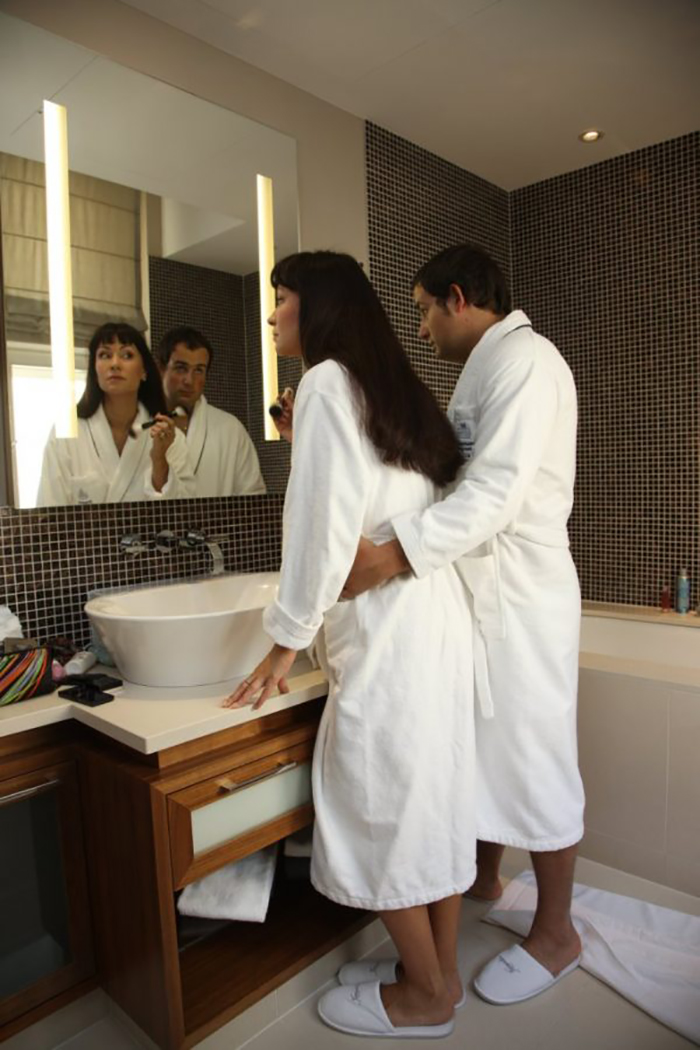 Стены украшают картины и фоторамки со снимками семьи, камин в гостиной и бронзовые статуэтки. В гостевой комнате стоит зеленый кожаный диван. На кухне стильная мебель с огромным обеденным столом, накрытым скатертью. С балкона, который украшен плетеной мебелью, открывается необыкновенной красоты вид на бухту. Черногорский свежий воздух и солнце снимают усталость.
