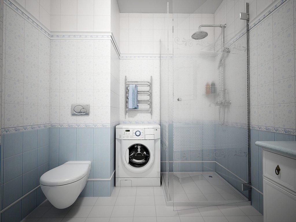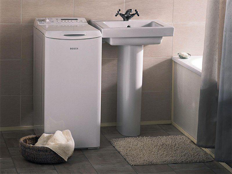 Для маленького помещения лучше остановиться на модели с вертикальной загрузкой. Правильным решением станет установка стиральной машины в любой из свободных углов ванной комнаты.