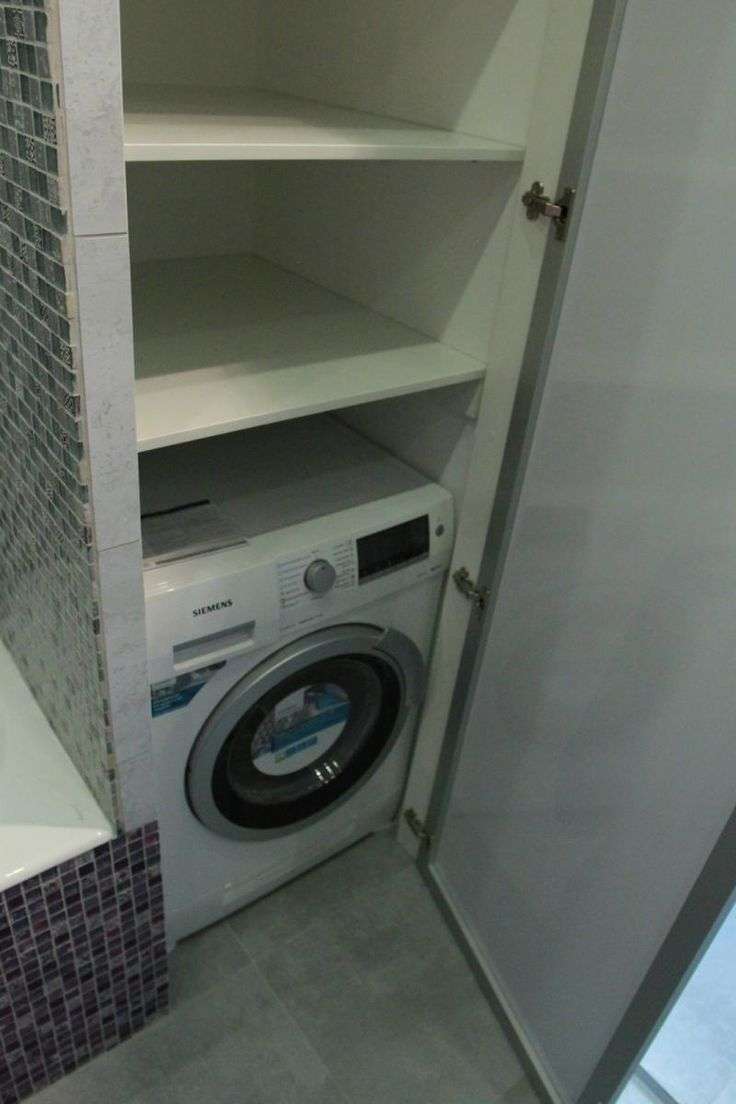 Встраивание — практичный и удобный способ размещения техники. Можно комбинировать стиральную машину с комодом или умывальником, либо сделать продолжением навесного шкафа.