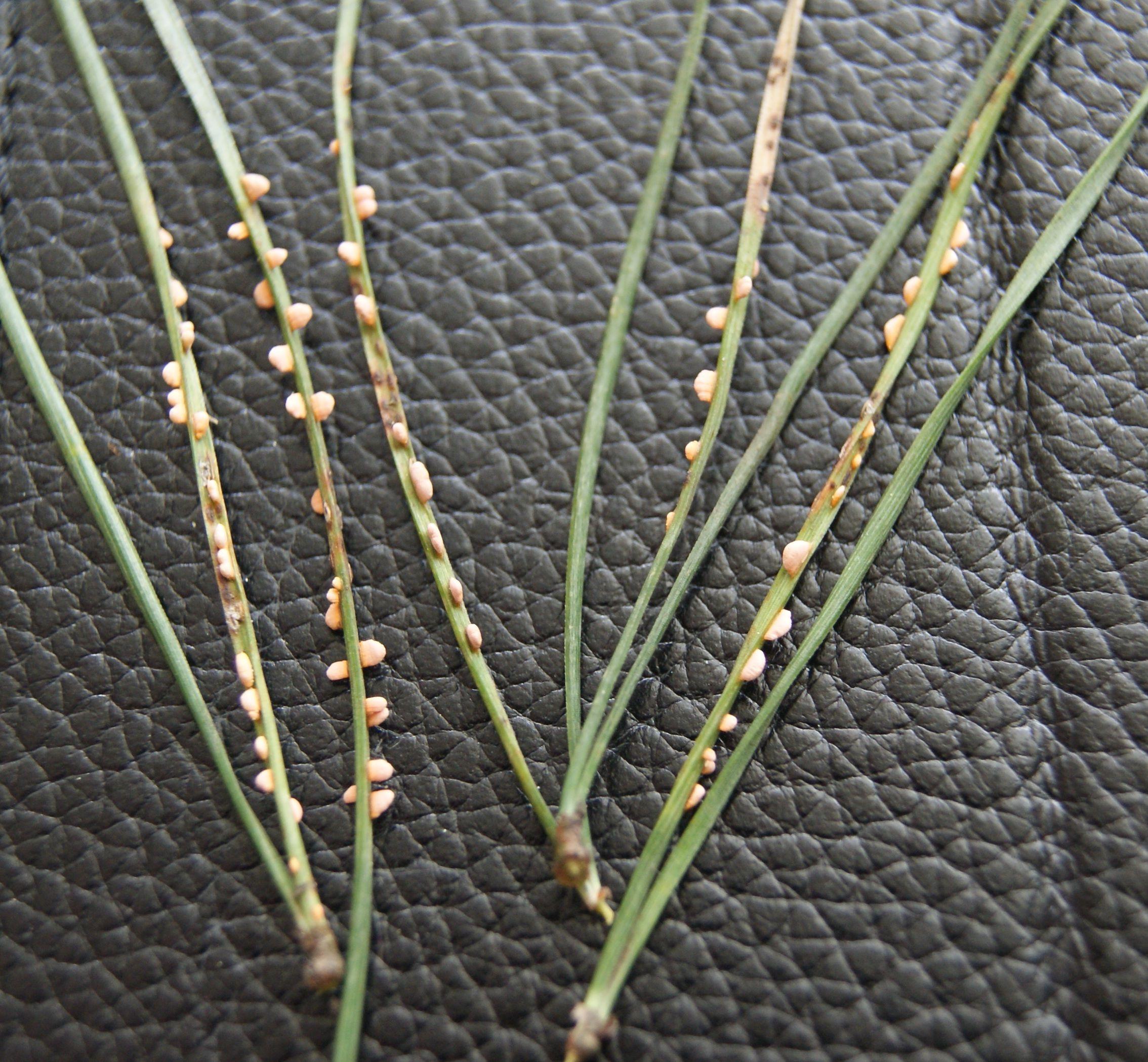 - Ржавчина хвои. По обе стороны хвоинок образуются желтоватые пустулы. В дальнейшем хвоя желтеет и опадает.