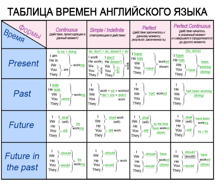 Каждая форма имеет разный способ образования глаголов, которые выступают в предложении сказуемыми. С помощью них и можно определить время. Подробная таблица для наглядности: