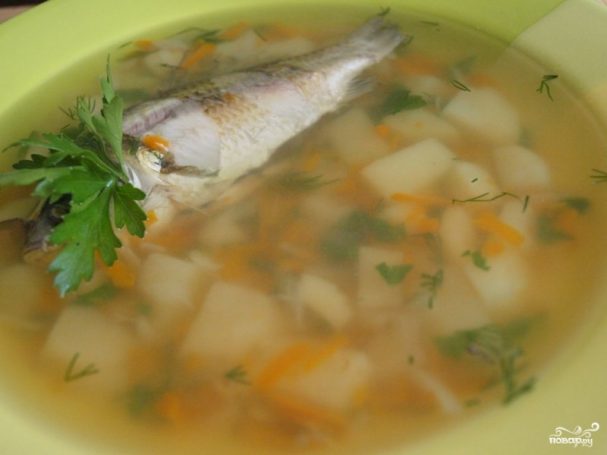 Пока суп варится, можно заняться рыбой. Ее очищаем от чешуи и внутренностей. Разрезаем карася на кусочки, и опускаем в кипящую воду. Добавляем в суп лук и перец, а также водку и масло. Перед подачей на стол в суп добавляется некоторое количество зелени.