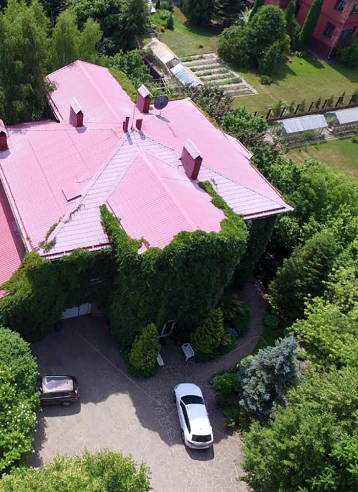 Весь участок и постройки утопают в зелени декоративных кустарников: туй, берез и елей. Фасад дома до самой крыши обвит плетущимся кустарником. Возможно, идея вертикального озеленения принадлежит хозяйке (Елена Проклова училась на курсах ландшафтного дизайна).
