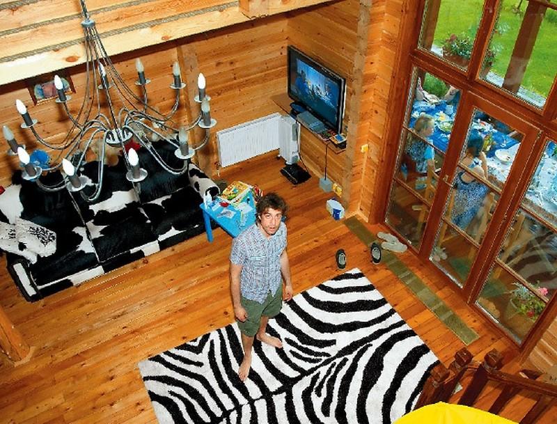 На первом этаже находится просторная гостиная с мебелью в черно-белой цветовой гамме и камином. Который из-за ошибки строителей пришлось переделывать. Образование свищей чуть не привело к пожару.