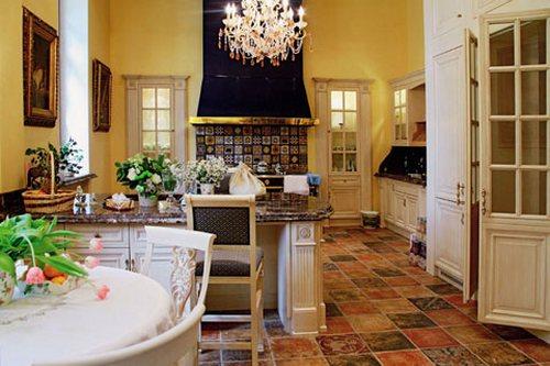 Так же на первом этаже находится и кухня ее интерьер выполнен известным дизайнером и хоть сделана она под старину это не помешало поместить в нее все самое современное и новейшее кухонное оборудование.