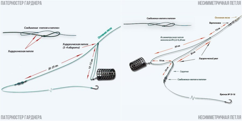 Зачастую используют патерностер и петлю Гарднера. Что касается «вертолёта», то его монтаж осуществляют лишь тогда, когда необходимо варьирование горизонта ловли. Если говорить об инлайне, то он даёт хороший результат вместе с кормушками-пружинками, для того чтобы рыбу прикармливать кашами.